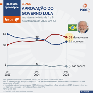 Pesquisa Ipsos/Ipec divulgada nesta 5ª feira (11.set.2025) mostra que 51% dos brasileiros dizem desaprovar a gestão do presidente Luiz Inácio Lula da Silva (PT), enquanto 44% declaram aprovar a gestão petista. Na comparação com o levantamento feito em junho, a taxa de desaprovação caiu 5 pontos percentuais, enquanto a aprovação subiu 5 pontos percentuais….