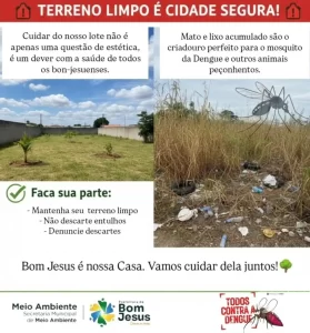 A Prefeitura de Bom Jesus iniciou uma campanha de limpeza de terrenos com o objetivo de combater a proliferação do mosquito Aedes aegypti, transmissor da dengue. A ação reforça a importância da participação da população na prevenção da doença.