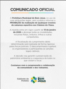 O comunicado foi publicado na página oficial da Prefeitura de Jesus no Instagram. Segundo o órgão, a medida visa garantir a preservação do patrimônio ambiental e a segurança de todos os que visitam o local.