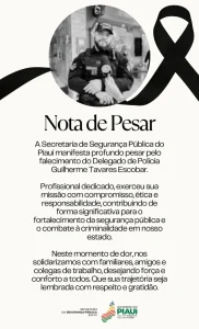 “A Secretaria de Segurança Pública do Piauí manifesta profundo pesar pelo falecimento do Delegado de Polícia Guilherme Tavares Escobar. Profissional dedicado, exerceu sua missão com compromisso, ética e responsabilidade, contribuindo de forma significativa para o fortalecimento da segurança pública e o combate à criminalidade em nosso estado”, diz o comunicado.